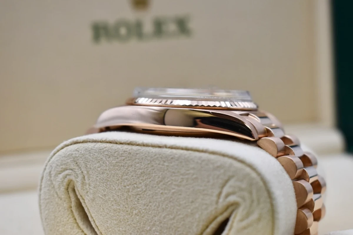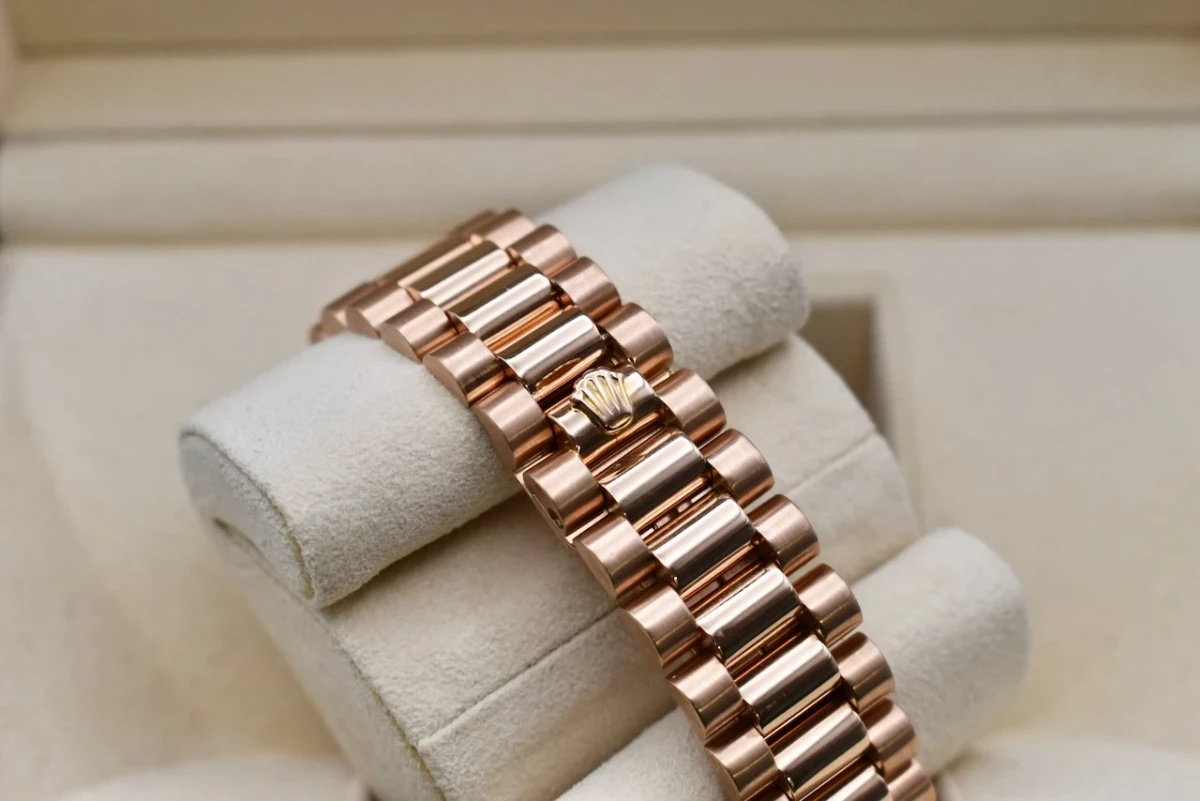 The 1803 model also features a President bracelet, which is unique to Rolex and is known for its comfortable and luxurious feel. Made of 18k rose gold, this bracelet has three semi-circular links and a hidden Crownclasp for a seamless look.