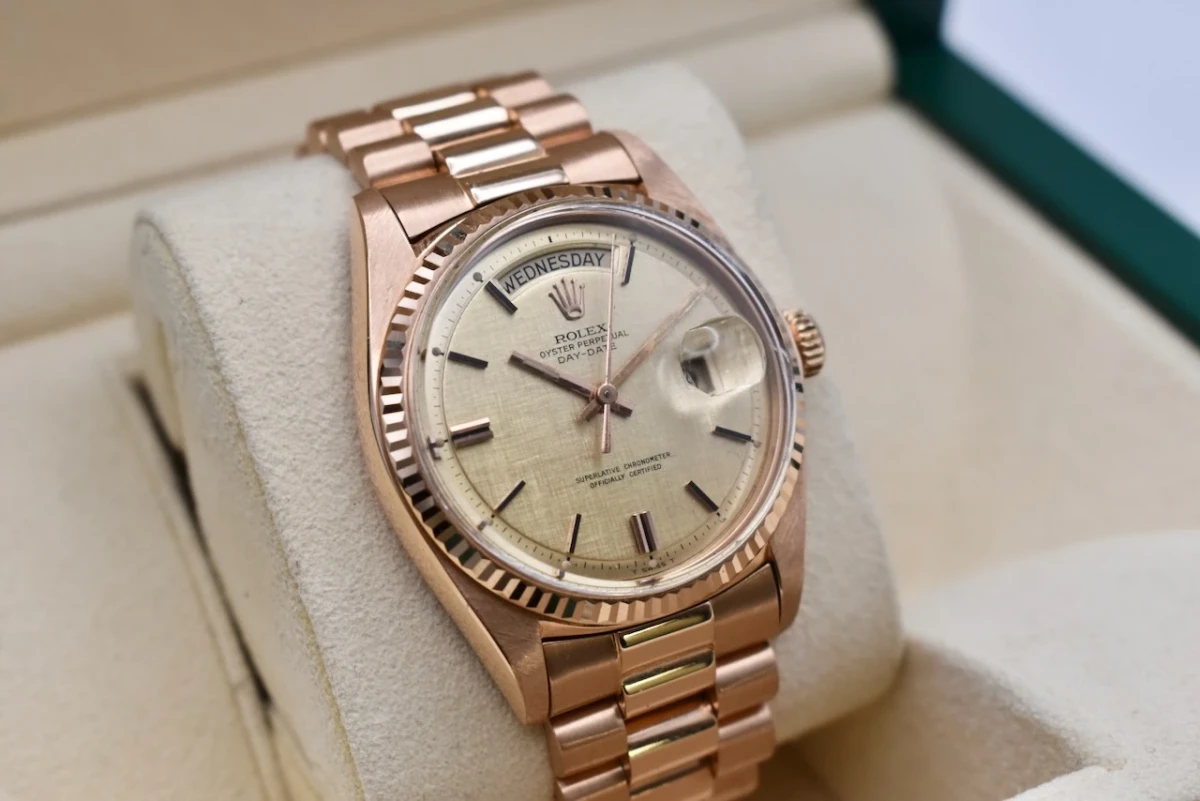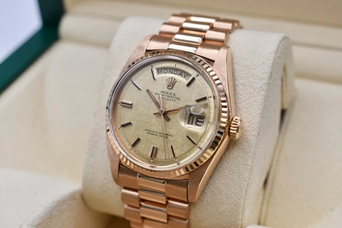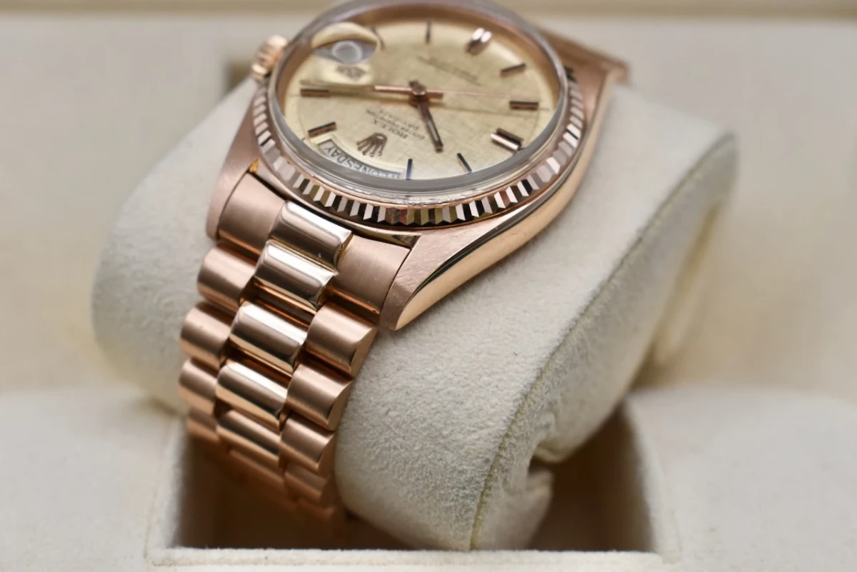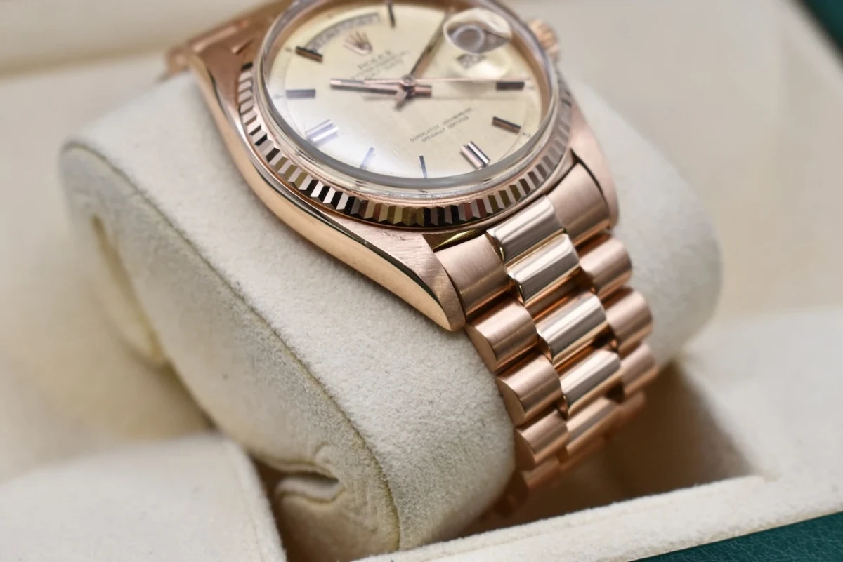 Overall, the 1976 Rolex Day Date 1803 in rose gold on President bracelet exudes sophistication and luxury. It is a classic and timeless timepiece that has become a symbol of success and status.
