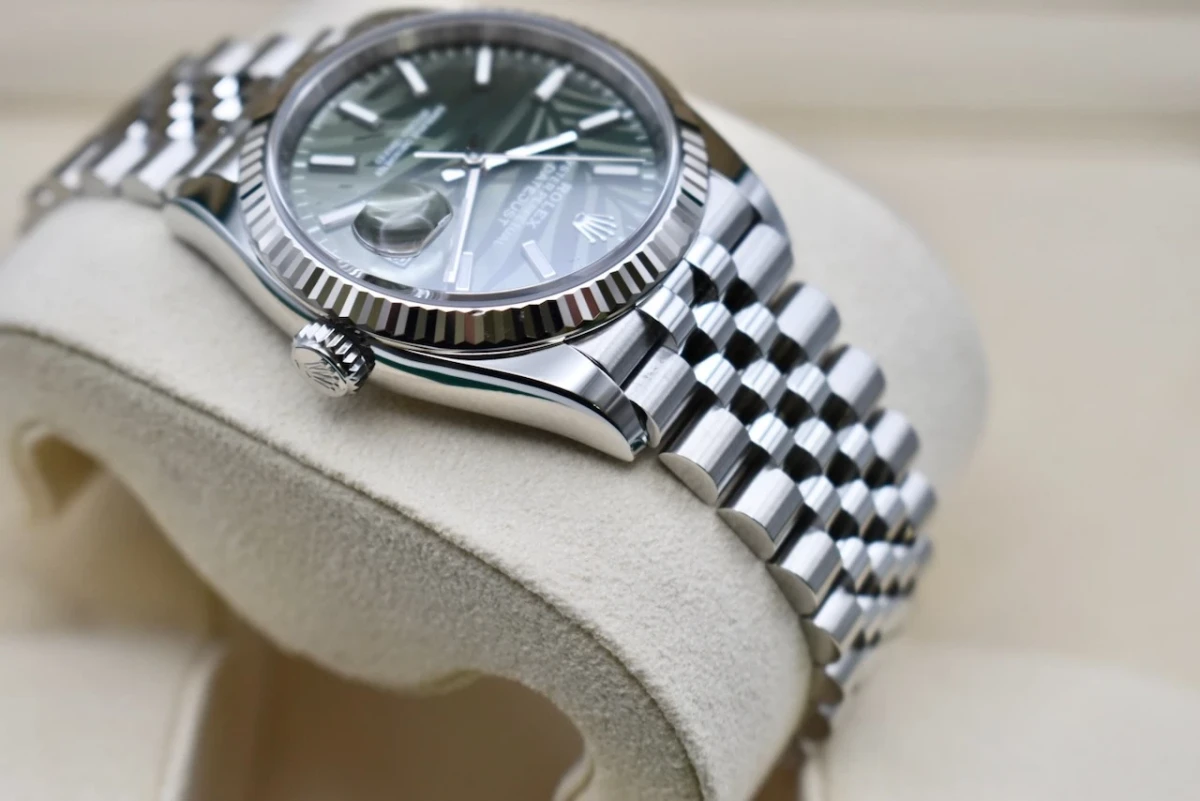 The Rolex Datejust 36mm is a classic and iconic model in the brand's collection, known for its timeless design and sophisticated look. The discontinued green palm dial on jubilee bracelet adds a unique and eye-catching element to the watch.