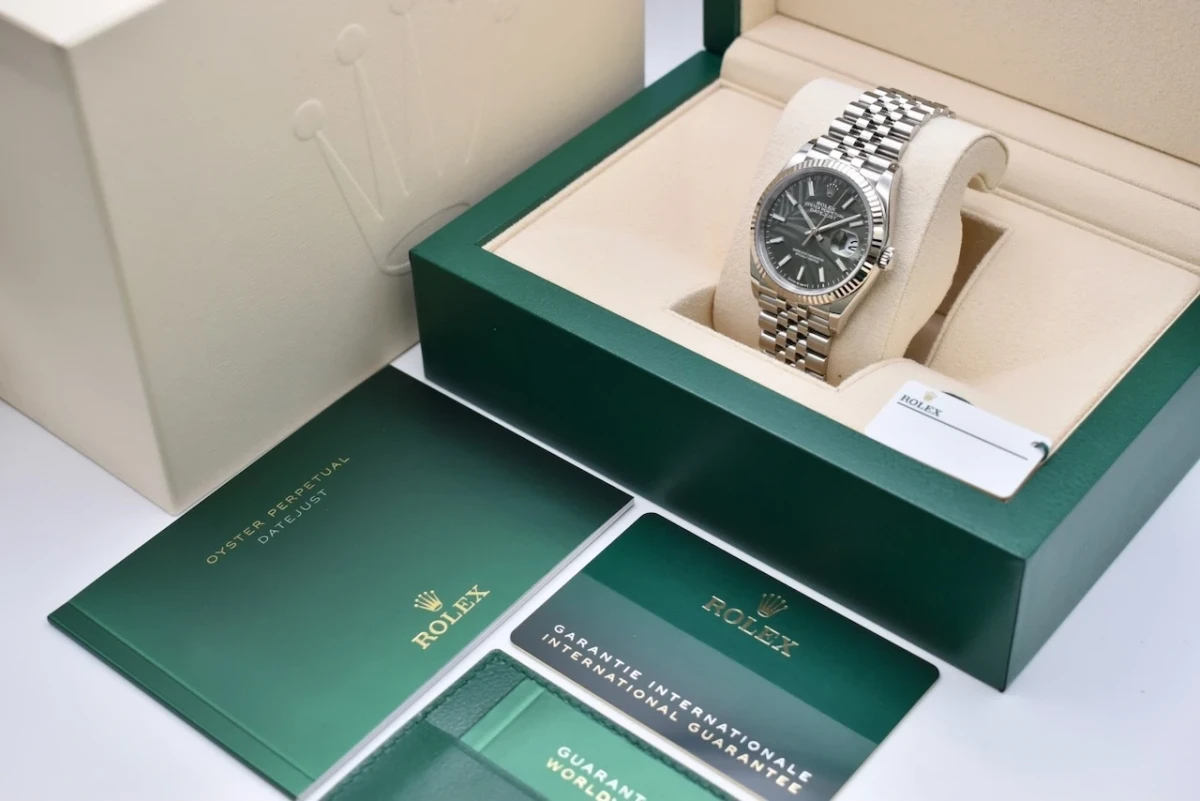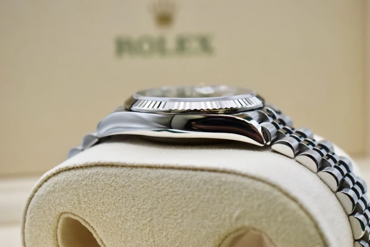 The Datejust 36mm is powered by Rolex's self-winding calibre 3235 movement, known for its reliability and accuracy. The watch also features a date window at the 3 o'clock position, which can be easily adjusted using the crown.