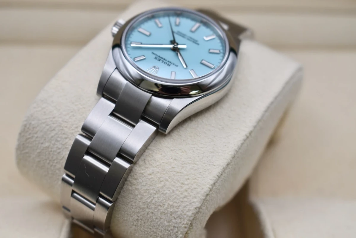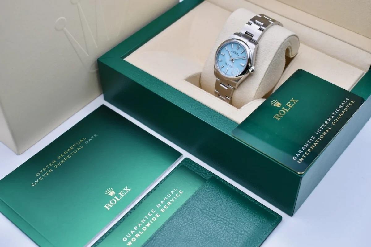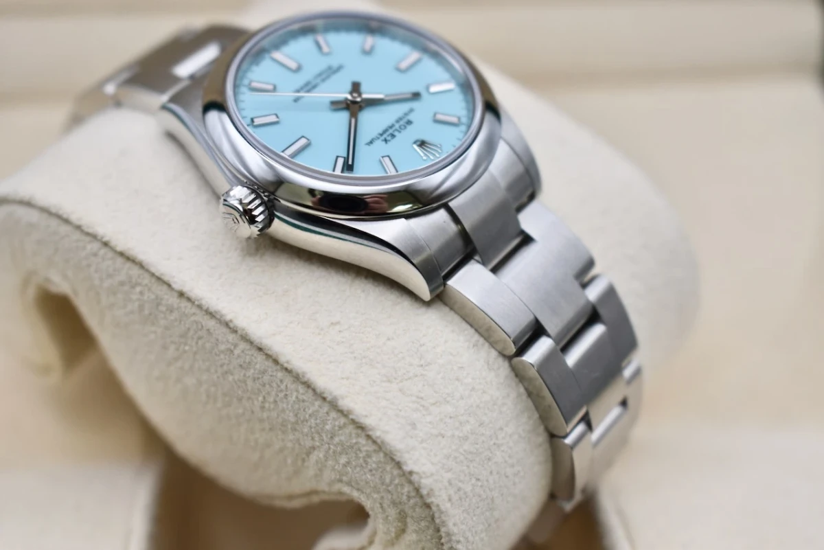 The Rolex Oyster Perpetual 31 (Ref. 277200) with the sought-after Tiffany Blue dial is one of the most desirable modern Rolex timepieces, combining timeless design with rare collectability. Crafted in stainless steel (Oystersteel) and featuring a smooth bezel, this 31mm model captures the essence of Rolex’s heritage while standing out with its vibrant dial colour.The Tiffany Dial variant of the Oyster Perpetual has become a global icon, highly prized by collectors and enthusiasts alike for its scarcity and striking aesthetic. At 31mm, this watch is a versatile size, making it perfect as both a ladies’ Rolex and a unisex Rolex model. Powered by Rolex’s perpetual mechanical movement, it guarantees precision, durability, and the prestige that only a Rolex Oyster Perpetual can deliver.Available now from Tempus Lord, based in the heart of Hatton Garden, London’s world-renowned jewellery district, this Rolex Oyster Perpetual Tiffany Blue 277200 is offered in new and unworn condition, with full authenticity guaranteed.