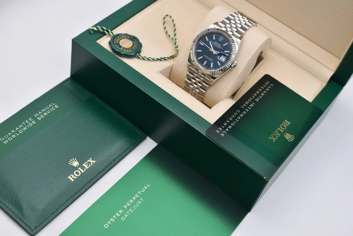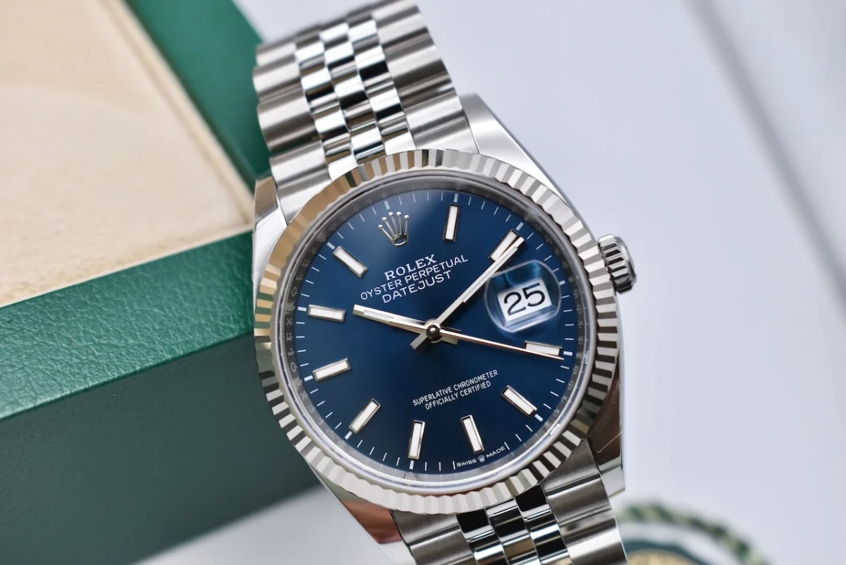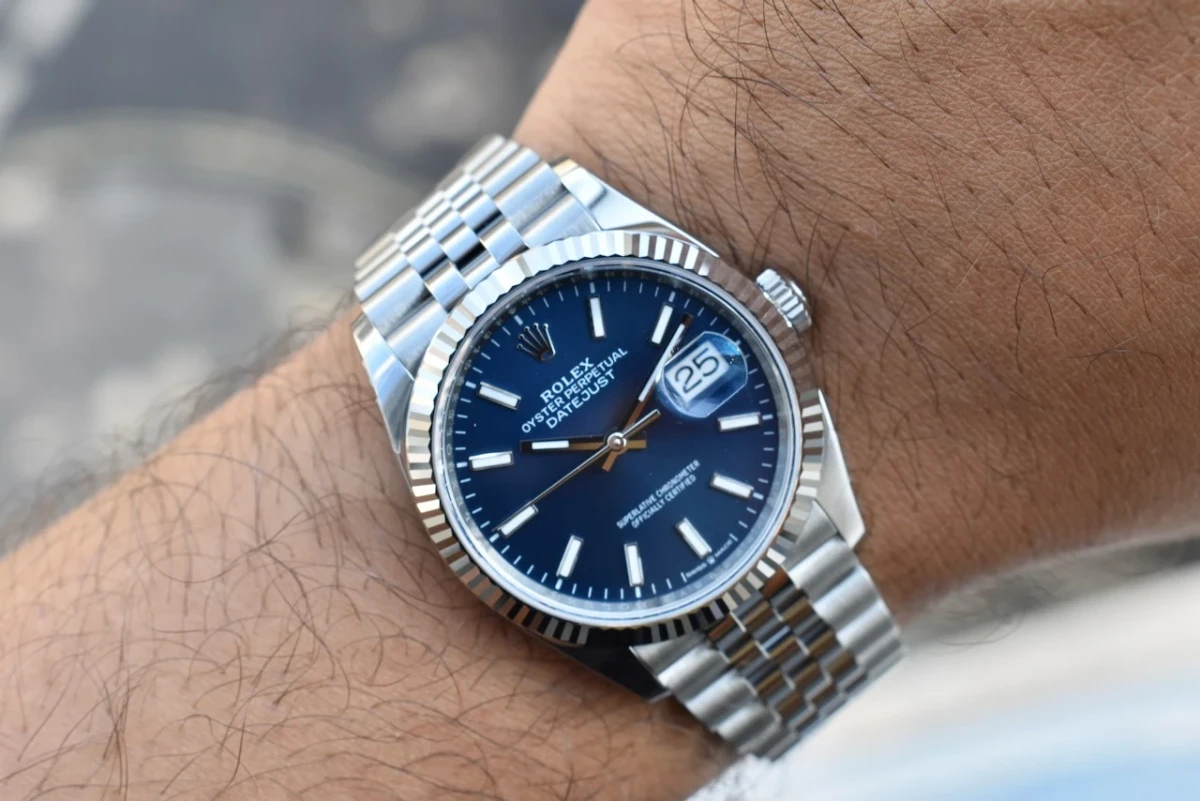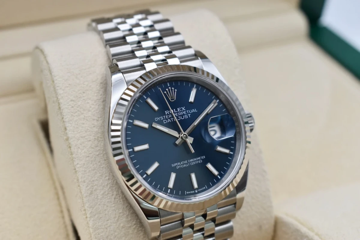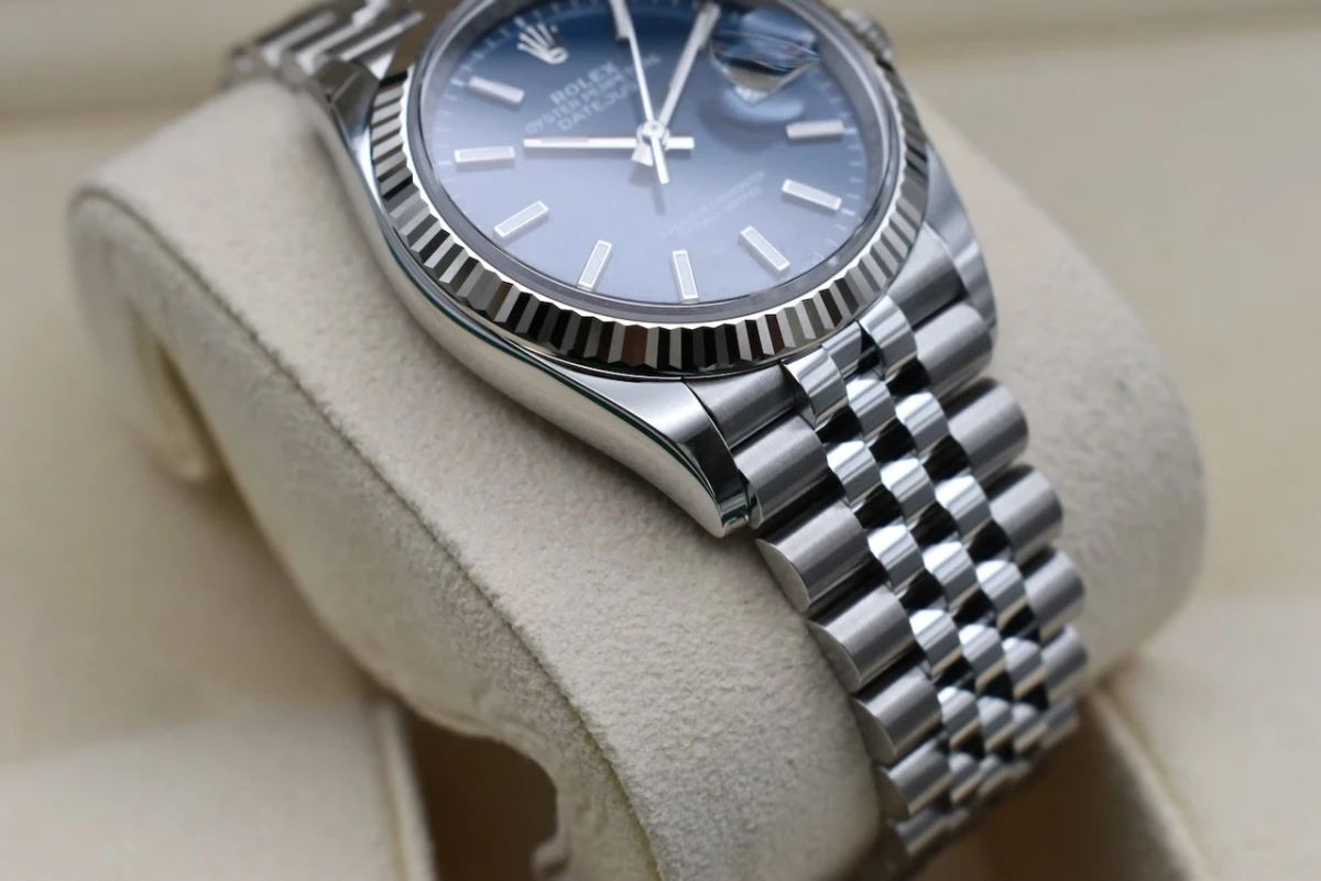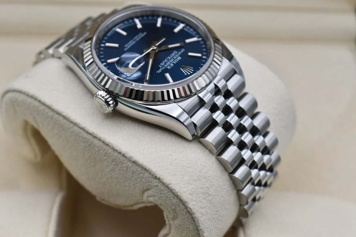 Overall, the Rolex Datejust 36mm with the blue baton dial, fluted bezel, and jubilee bracelet is a true masterpiece that combines timeless elegance with modern sophistication. It is the perfect watch for any occasion, whether it's a formal event or a casual day out. With its impeccable craftsmanship and attention to detail, it is a true testament to the excellence and legacy of the Rolex brand.