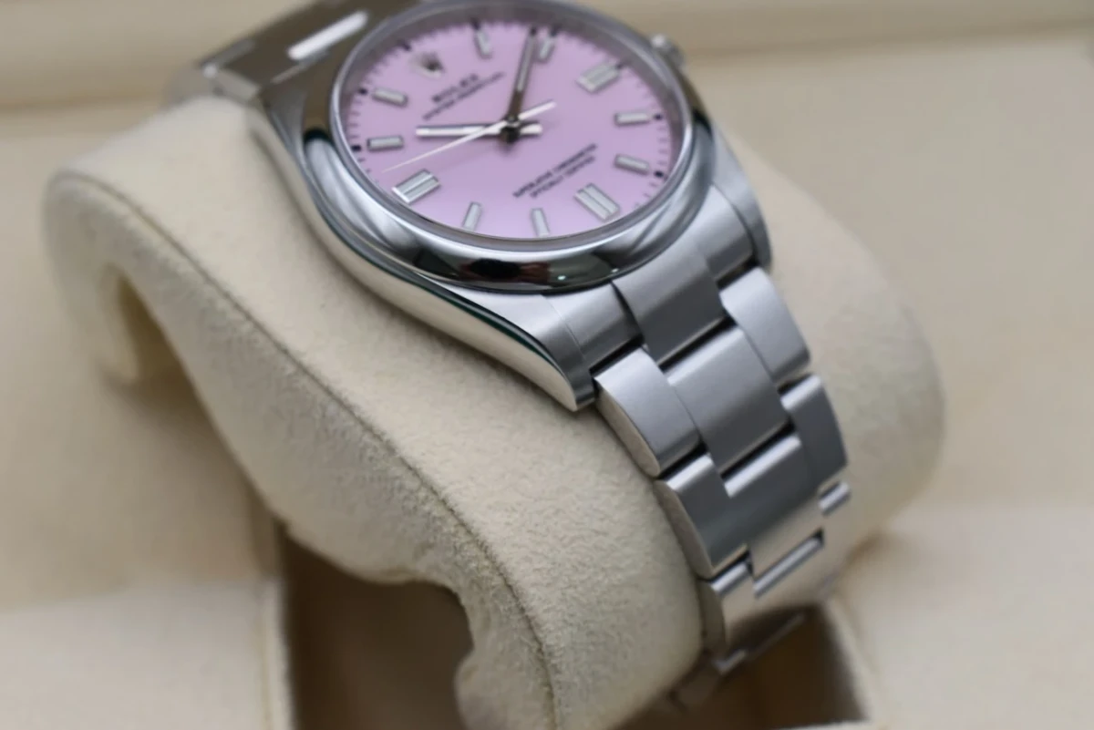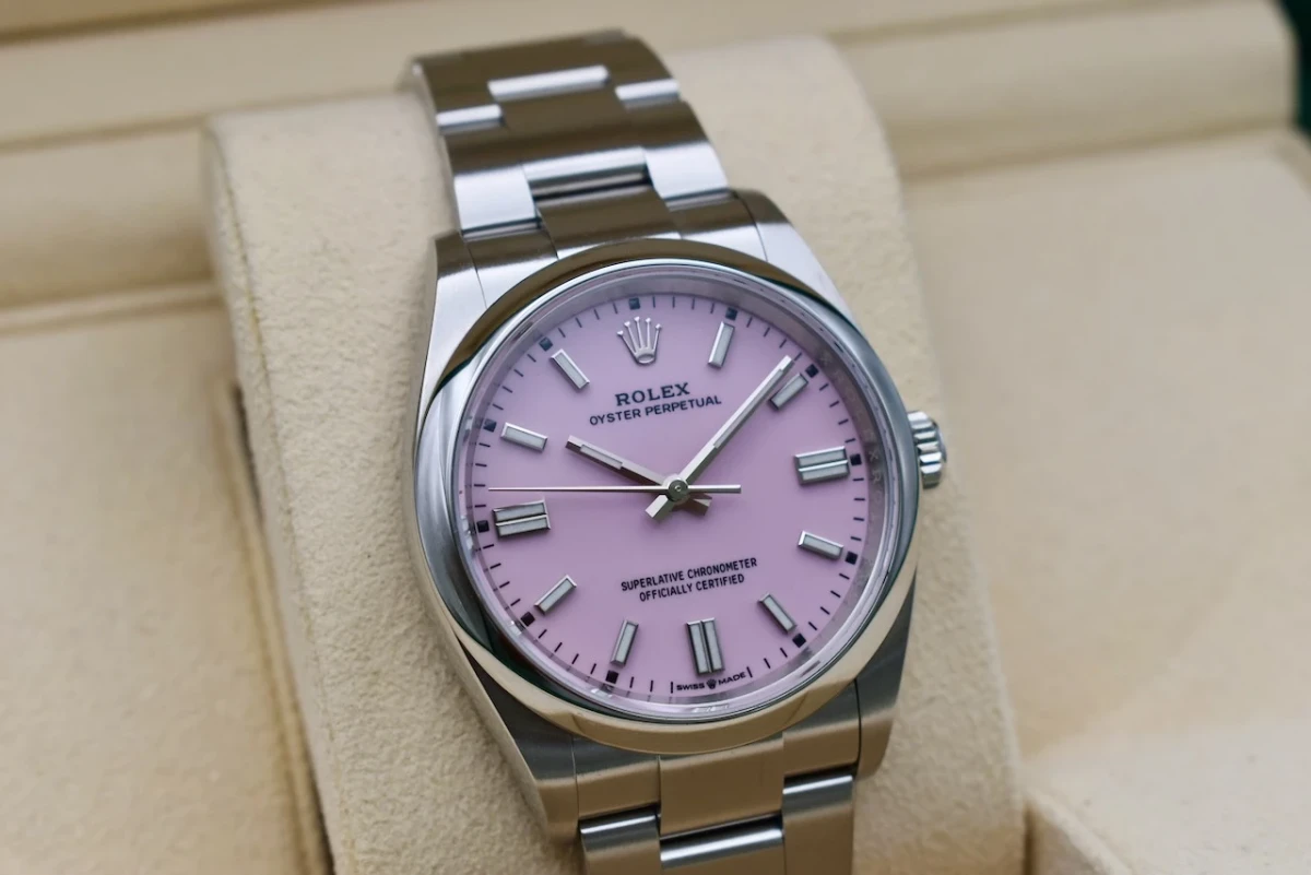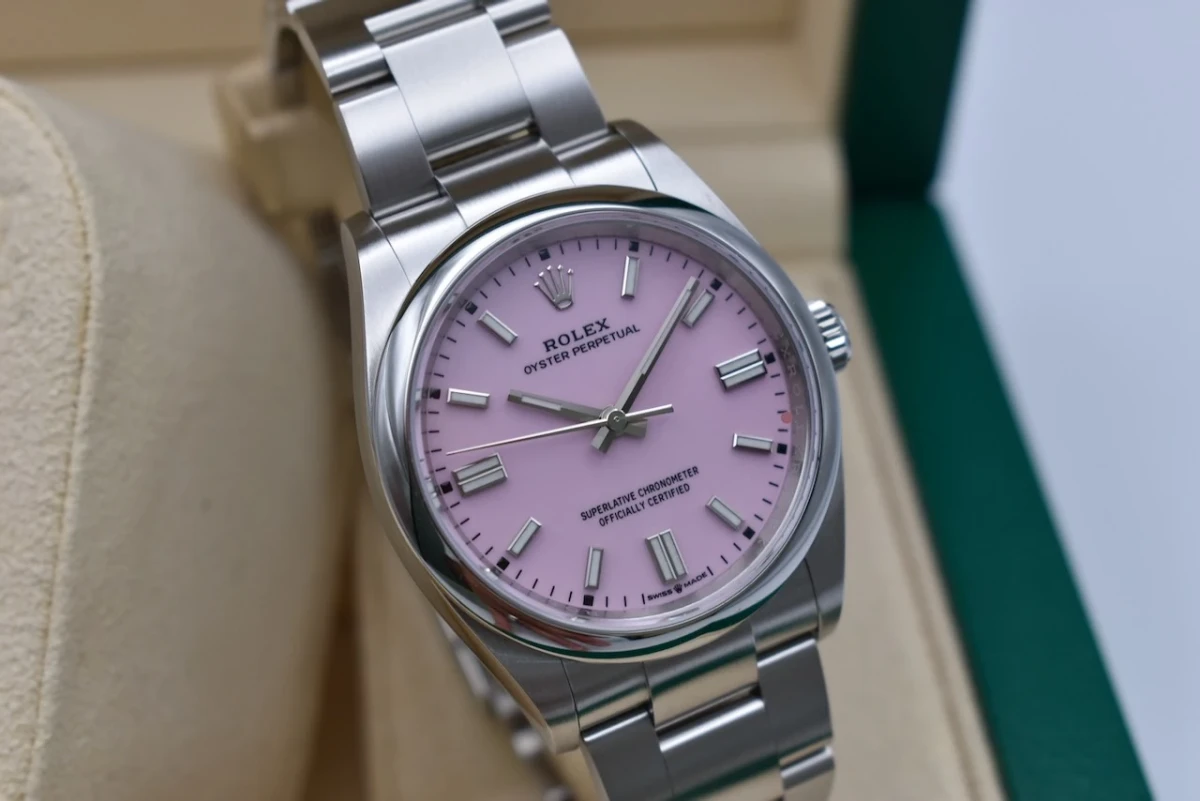 Here for sale we have the 36mm Oyster Perpetual by Rolex featuring the 'Candy Pink' dial. Proven to be a versatile wristwatch among our female clients. This model is crafted in stainless steel and is the 36mm model. Our watch was retailed in 2023 and is complete with box and papers and is offered in excellent condition.