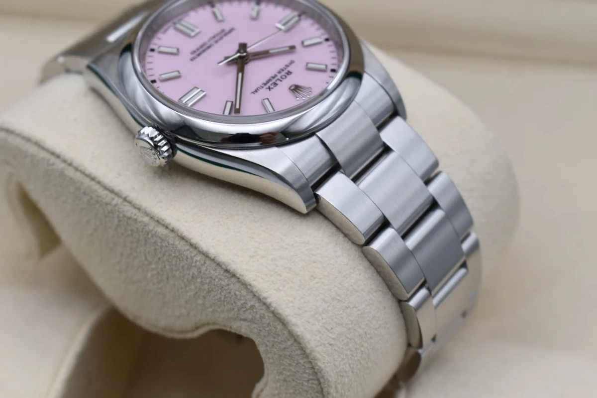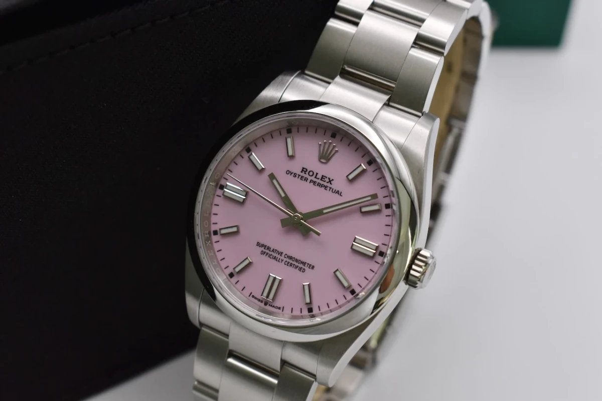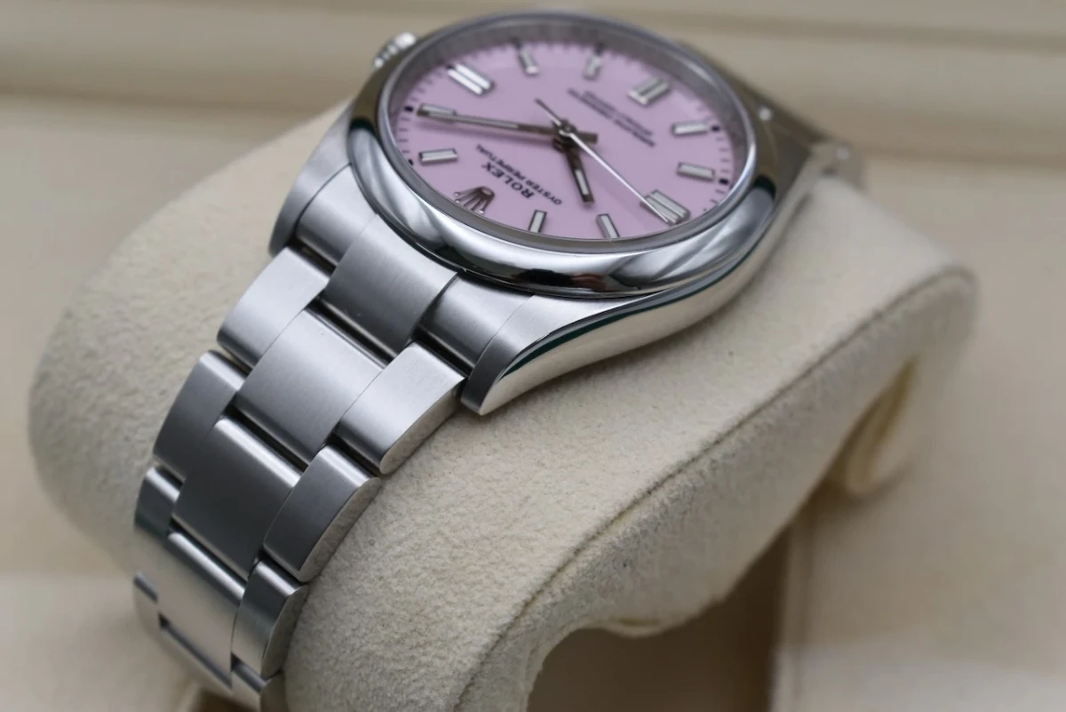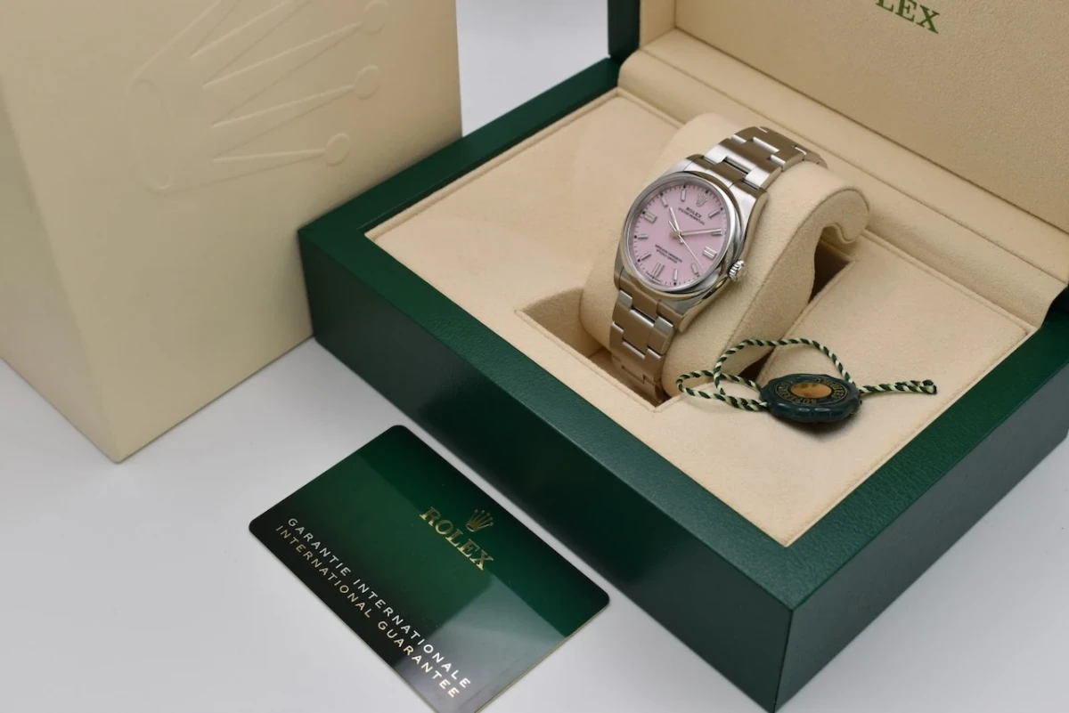 Here for sale we have the 36mm Oyster Perpetual by Rolex featuring the 'Candy Pink' dial. Proven to be a versatile wristwatch among our female clients. This model is crafted in stainless steel and is the 36mm model. Our watch was retailed in 2023 and is complete with box and papers and is offered in excellent condition.