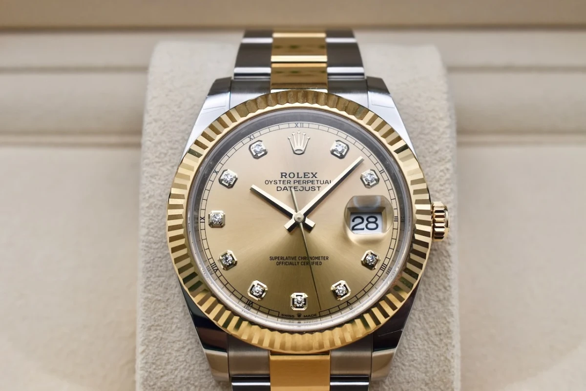 Originally created for international pilots, the GMT-Master II features a dual time zone complication, allowing the wearer to track multiple time zones with ease. The striking blue and black bezel insert earned the nickname “Batman,” symbolising both strength and exclusivity in the Rolex sports watch line-up.